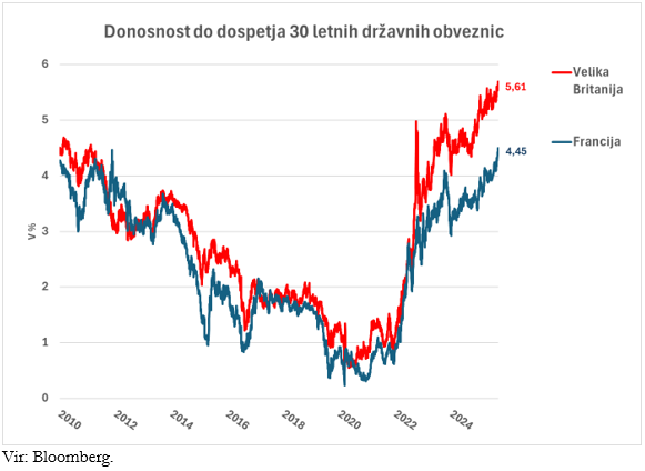 V 2025 se nadaljuje dvig zahtevanih donosnosti dolgoročnih obveznic. V začetku septembra je donosnost 30 letnih angleških državnih obveznic dosegla 5,7 %, kar je najvišja vrednost po letu 1998, torej v zadnjih 27 letih. Podobno, čeprav malce manj izrazito, so se v zadnjem času gibale tudi donosnosti dolgoročnih obveznic širom zemeljske oble. Nemške 30 letne državne obveznice so bile s 3,4 % najvišje v zadnjih 15 letih, francoske primerljive obveznice pa z 4,5 % donosnostjo najvišje po letu 2009. Dvig dolgoročnih obrestnih mer je hkrati v popolnem nasprotju gibanja kratkoročnih obrestnih mer, ki se pod težo nižanj referenčnih obrestnih mer centralnih bank v zadnjih dvanajstih mesecih znatno nižajo. Zakaj torej dolgoročne obrestne mere rastejo, če se kratkoročne nižajo?