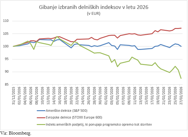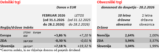 Večji del februarja so zaznamovale skrbi glede novih programskih orodij umetne inteligence (UI), ki bi lahko ohromila poslovanje podjetij v določenih segmentih in njihovo dobičkonosnost. Dodaten vpliv na svetovno gospodarstvo je imela razveljavitev carin predsednika Trumpa s strani ameriškega vrhovnega sodišča. Posledično je bil februar boljši za evropski delniški trg kakor ameriški delniški trg. Evropske delnice so se v februarju podražile za +3,9 %, ameriške delnice pa so se pocenile za -0,3 % (v EUR).